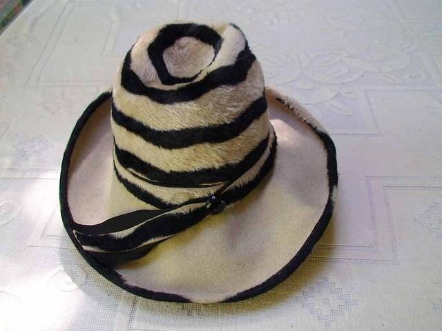 Ivory and black bulls-eye striped floppy brimmed pimp hat, with the stripes forming a bulls-eye at the top. Felt band, large black button