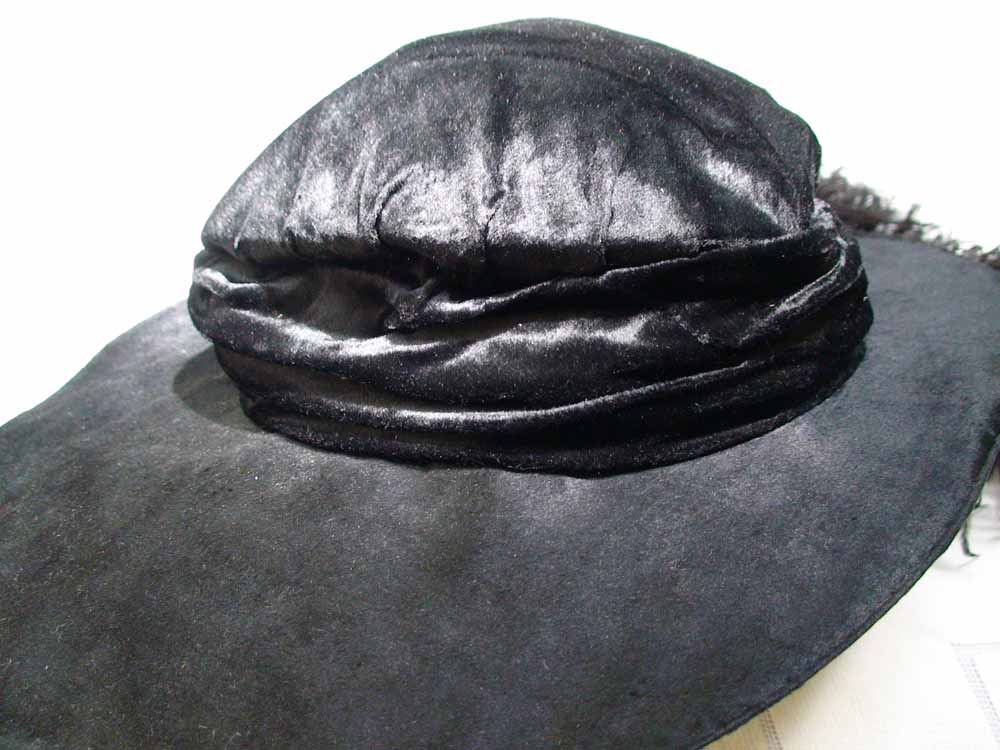 Black panne velvet capeline. Black ostrich plume under brim on left. Finely hand-sewn throughout. Lining has a drawstring bag to adjust fit. Drawstring is a flat woven braid.
