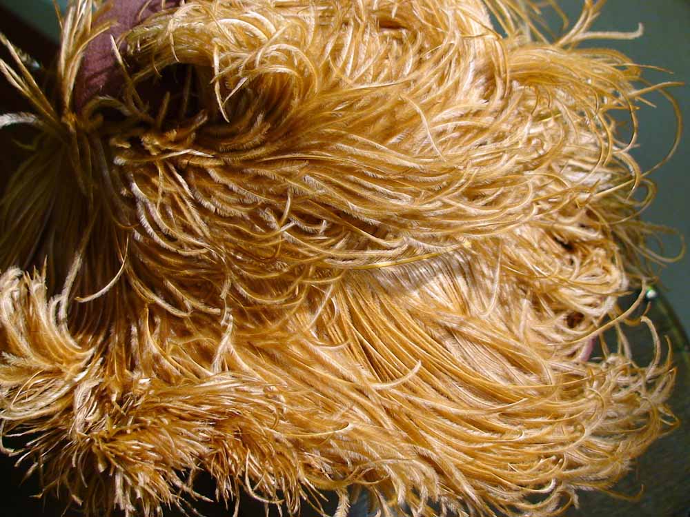 Rust felt fedora circled with large rust ostrich plumes.