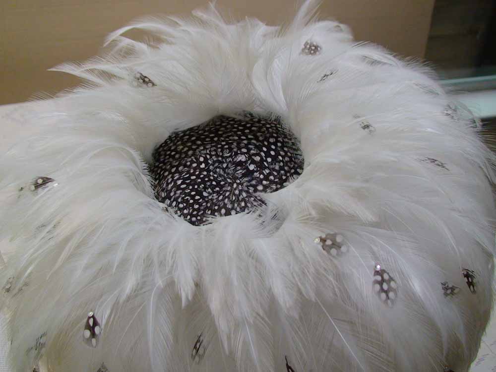 White allover feather bubble toque. Coq feathers are tipped with teardrop shaped cutouts from spotted partridge feathers & tipped with swarovski crystals. The crown is covered with the partridge feathers.