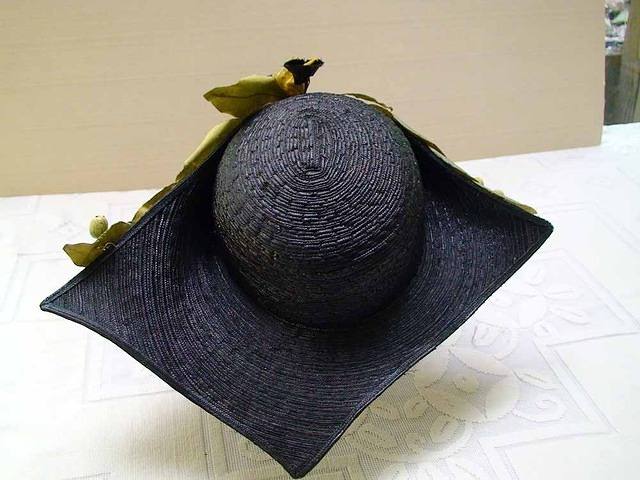 Black straw tricorne comprised of an asymmetrical rectangular brim with the front corner cut off and turned up, Sou'wester style, and an off-center crown. The front is decorated with leaves and celluloid fruit and olives.