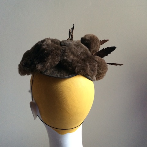 Mouton fur tilt Juliet cap with pompom fruit and felt leaves.