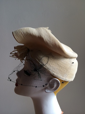 Late 30s ivory sculpted Juliet cap, with ivory flowers and navy veil with large flower.