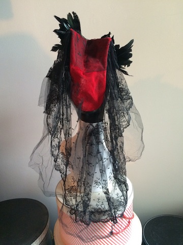 WW2 red riding hat with Chantilly lace veil and two coque feather sprays.