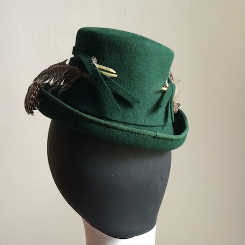 WW2 deep green doll hat with guinea fowl feathers.