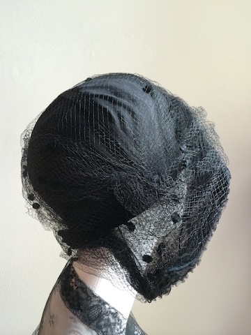 Pre-1920 silk bicorne cloche with wired net brim and bakelite hat flash