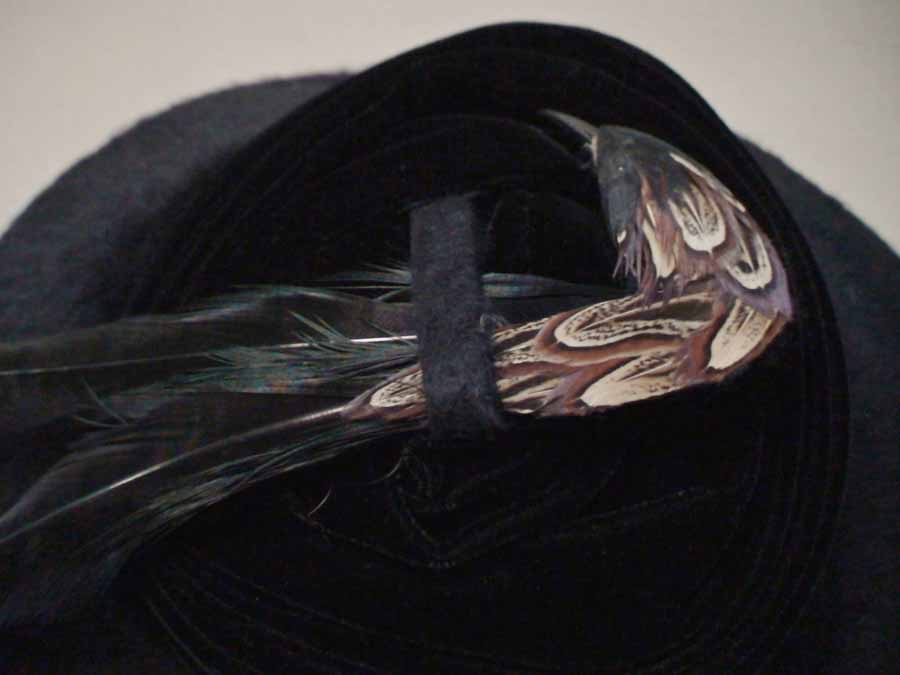 Black long pile fur felt Audrey hat with ruched velvet crown and faux bird.