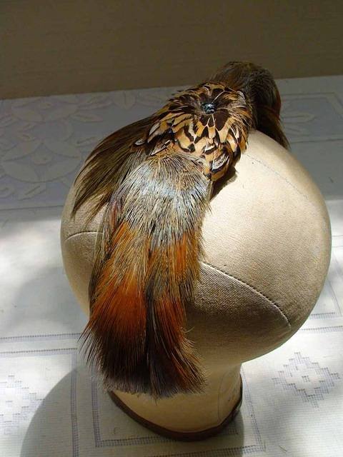 Unusual bandeau with wing-like arches that stand up on each side. Entire bandeau is covered with pheasant feathers.