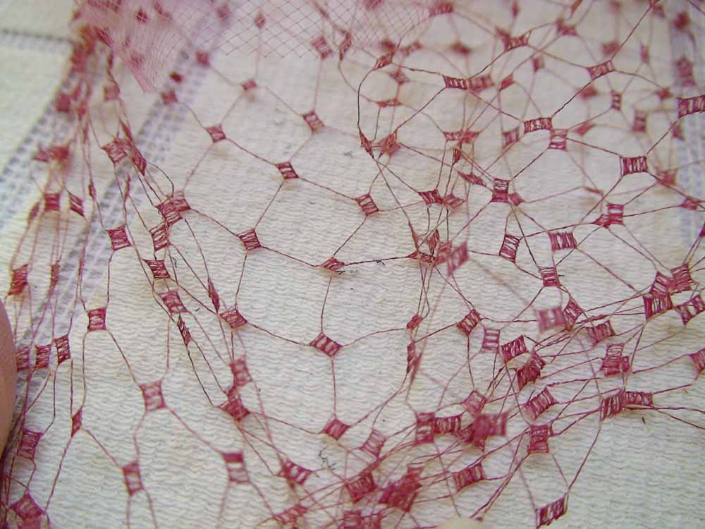 Hot pink satin bellhop hat with bow in back and two veils, one soft silk veiling with squares in corners and one a puffy polka-dot tulle.