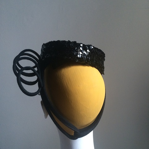 Black felt bellhop cap with black sequins. Mesh across sunken crown. Black felt loops to left side of double tilt strap.