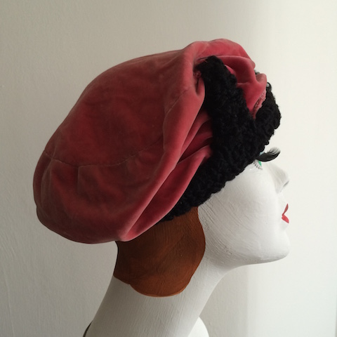Dusky pink velvet beret with wired frame of black Persian lamb.