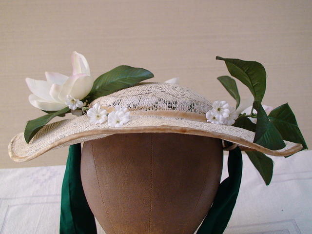 (no label) Cream straw lace bergere with silk magnolias and green tie