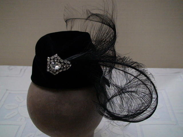 (Mr. Arnold Made to Order) Mini fez with jeweled brooch and curled burnt feathers.