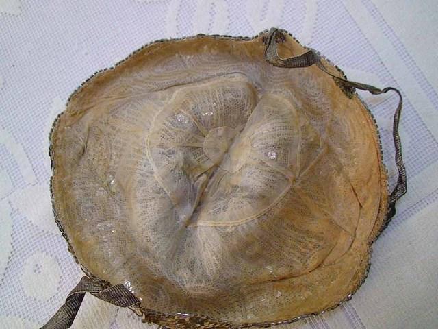 Ornate gold sequin calot (skullcap) worn by a 1920s cabaret dancer in her stage acts.