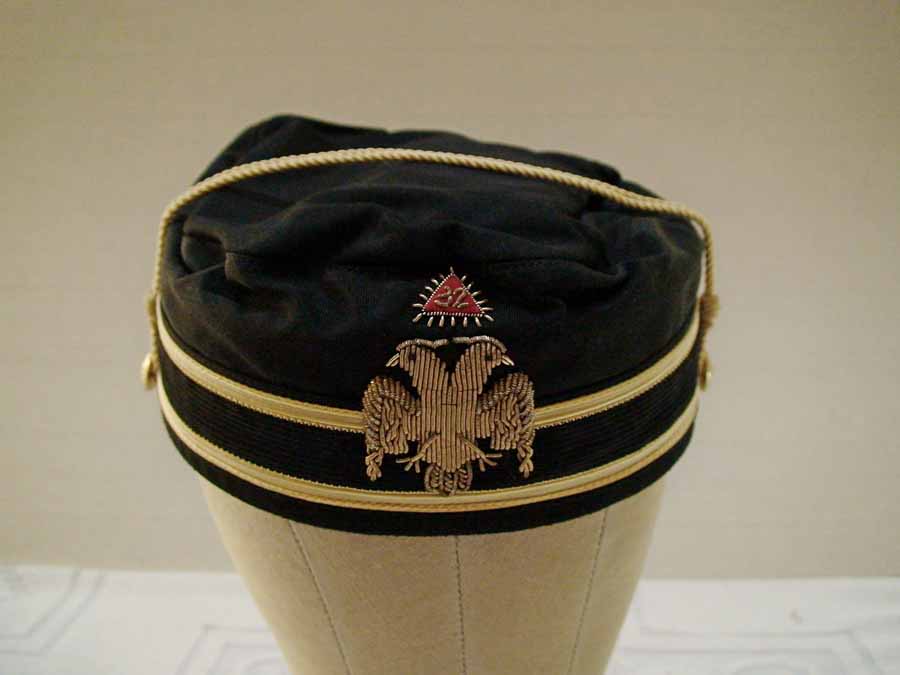 Ceremonial bell hop style hat from the Ancient and Accepted Scottish Rite of Freemasonry. Above the embroidered double headed eagle emblem, the red triangle has the number 32 embroidered in gold thread, probably signifying the 32nd degree.