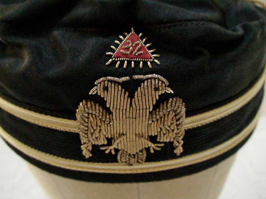 Ceremonial bell hop style hat from the Ancient and Accepted Scottish Rite of Freemasonry. Above the embroidered double headed eagle emblem, the red triangle has the number 32 embroidered in gold thread, probably signifying the 32nd degree.