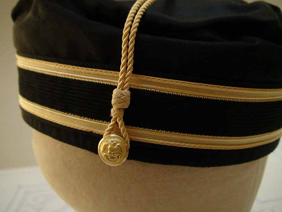 Ceremonial bell hop style hat from the Ancient and Accepted Scottish Rite of Freemasonry. Above the embroidered double headed eagle emblem, the red triangle has the number 32 embroidered in gold thread, probably signifying the 32nd degree.