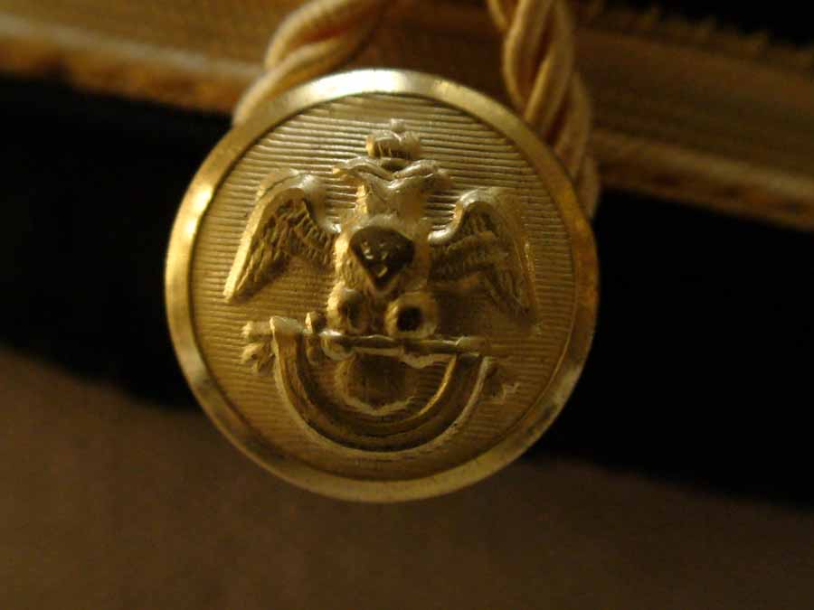 Ceremonial bell hop style hat from the Ancient and Accepted Scottish Rite of Freemasonry. Above the embroidered double headed eagle emblem, the red triangle has the number 32 embroidered in gold thread, probably signifying the 32nd degree.