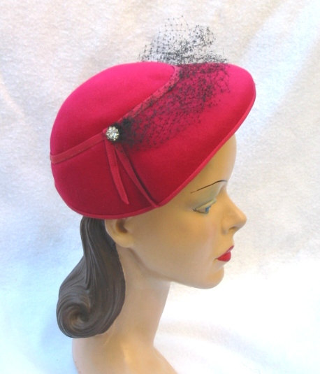 Pretty hat from the early to mid 50's. It is made of fuchsia felt in the popular clam shell style. It features rhinestone accents on either side.