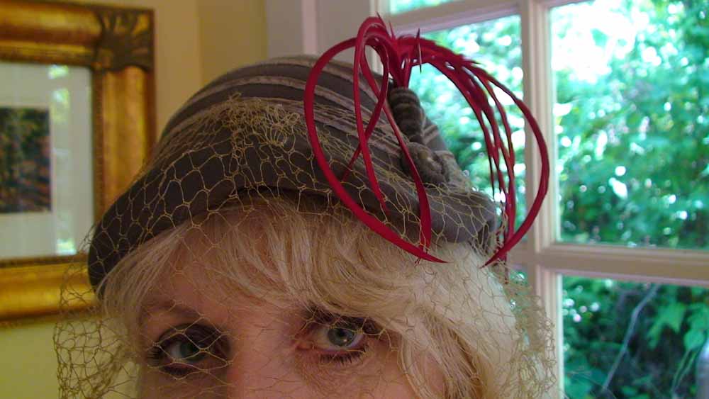 Gray felt art deco helmet-like cloche with spiral felt piping ornament and red biot feathers.