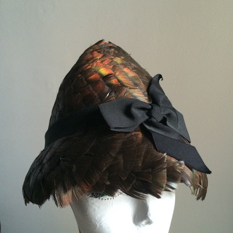 All-over pheasant feather cone hat with grosgrain bow