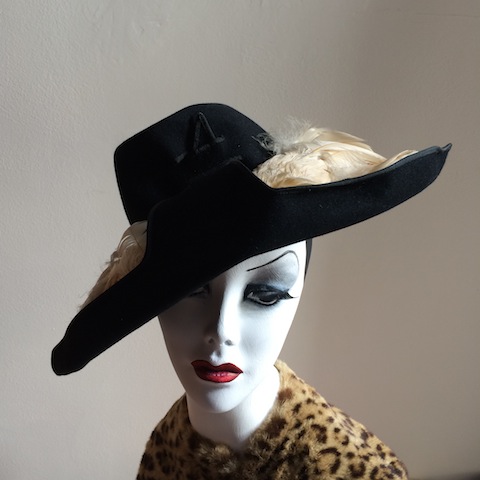 Black felt folded brim Cavalier with two pale peachy feather sprays.