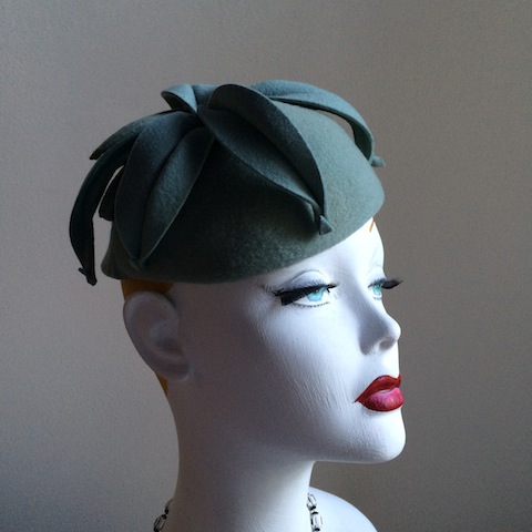 WW2 aqua blue felt skullcap with felt leaves and bow.