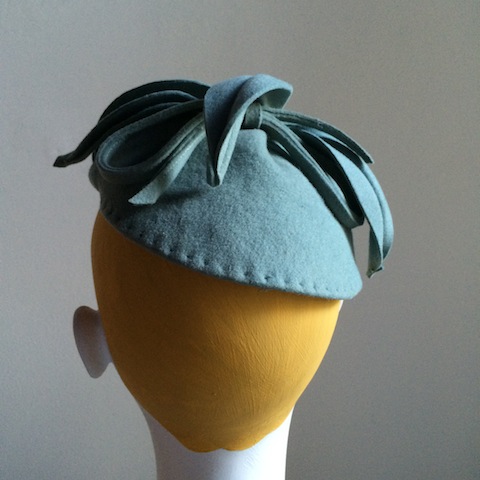 WW2 aqua blue felt skullcap with felt leaves and bow.