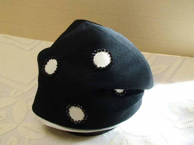 Black felt Phrygian-inspired cap with white leather spots and piping around brim