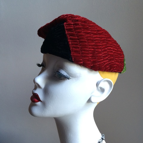 1930s Phrygian cap in black, red and green ruched silk velvet.
