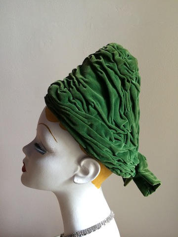 Late 1930s green ruched velvet sugarloaf