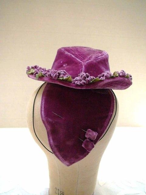 Burgundy velvet tilt doll hat with chenille flowers, velvet tipped hat pins and matching purse and coin purse