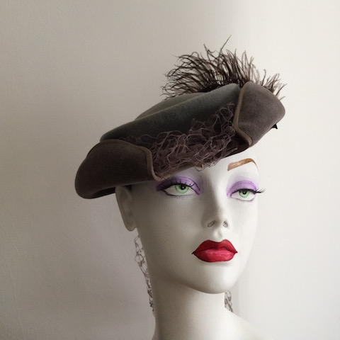 WW2 grey velour porkpie crown tricorne tilt with veil and ostrich feather