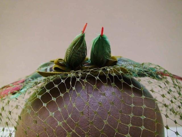 Green whimsy with two tiny made birds and veil that covers entire head ("bird cage veil")