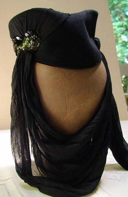Black felt heart-shaped sculpted toque tilt with sequined ornament and silk wimple chin veil, tilt strap in back.