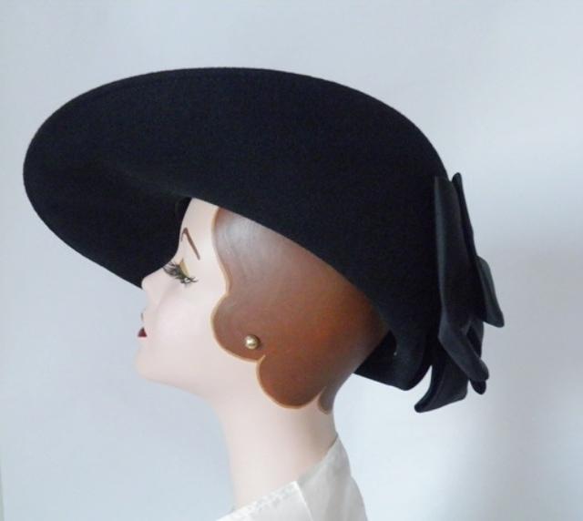 Black felt wide brimmed picture hat, upturned in back and anchored with huge bow