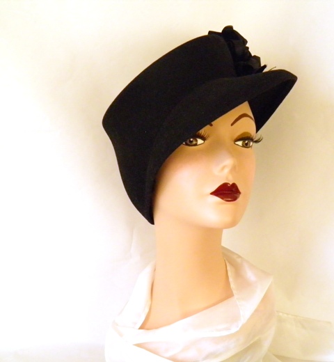 Black felt hat with front rolled brim and molded indented crown. Large black silk flower on the left side.