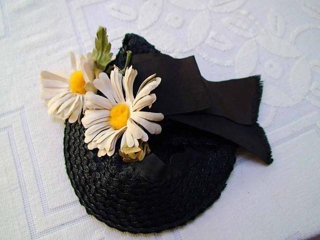 Black straw tilt with slanted crown, trimmed in cloth daisies.