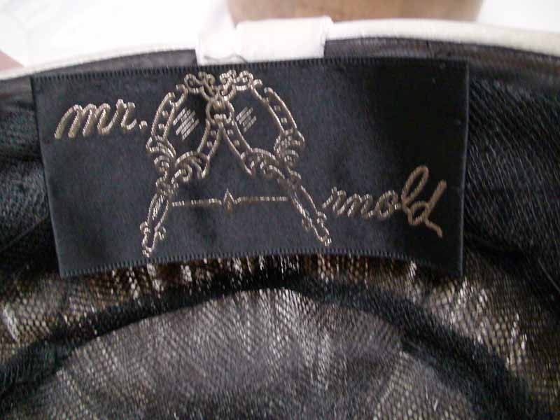 Surreal toque resembles shaving brush. The pillbox shaped crown is wrapped in folds of velvet. The top is an amazing brush concocted from thousands of tiny partridge feathers, standing on end. The top of the pillbox is see-through mesh, but you really can't tell how he did it by looking through. I think it is a long cloth tape with thousands of partridge feathers sewn on, then wrapped in a spiral with some sort of spacer between the layers to keep them spaced perfectly.