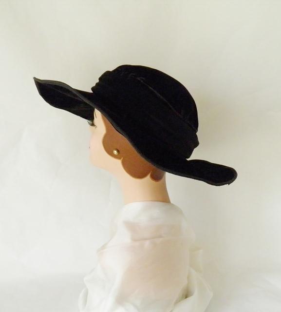 Black felt wide brimmed hat with black bird and blue flower. Brim is encircled with black velvet ribbon which forms a loop beneath the bird. Fully lined