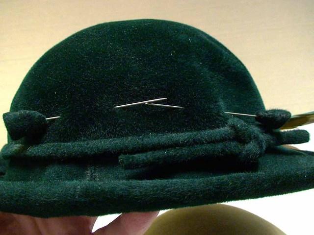 Dark forest green velour felt roller with taxidermy bird and two hat pins