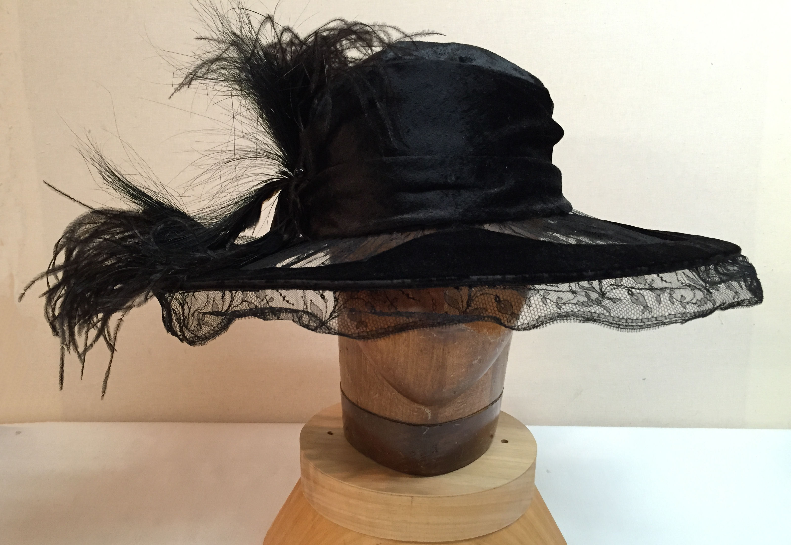 circa 1920; Picture hat; black velvet, lace, silver brim underfacing; on buckram and wire foundation