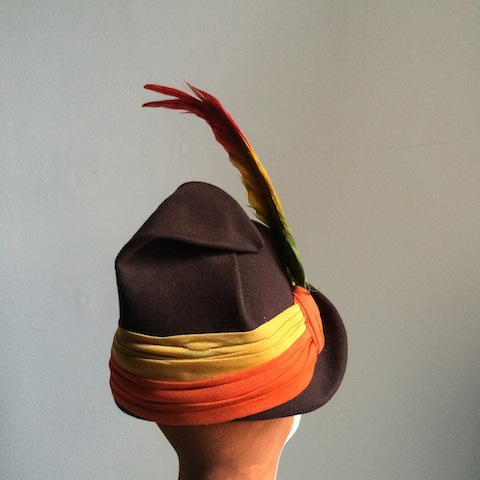 Robin Hood Phrygian toque in brown felt, with ruched orange and yellow rayon trim and dyed Lady Amherst pheasant feathers.