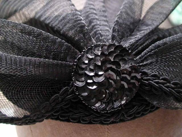 Black oval skullcap with ruched striped crinoline rosette-like feature, anchored in back with a sequined button. This hat was a present from my friend Eddie Dornak, who appreciates quality antiques and collectibles.