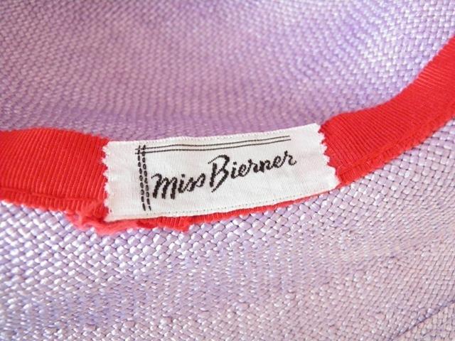 Lavender brimmed hat with floating veil. Narrow grosgrain ribbon encircles the crown and ends in the back with a double bow. Inside finished off with a red grosgrain ribbon.