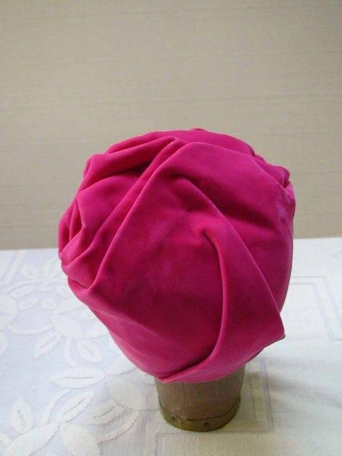 Fuchsia velveteen turban shaped like a rose bud