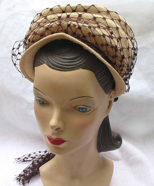 Mid to late 40’s straw peaked bonnet with netting down back.