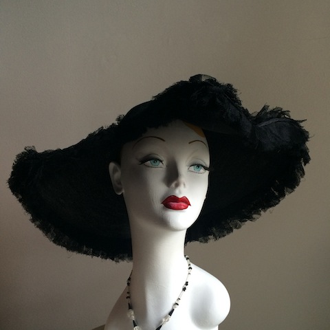 1930s black straw picture hat, with cut out section at front right side and waving brim at left. Rectangles of tulle line the entire circumference of the brim on the edge.