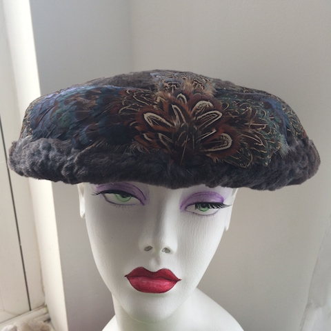 Grey fur mushroom toque with ornament of different colours of pheasant feathers (central section of feathers has been repaired using 'modern' pheasant feathers)