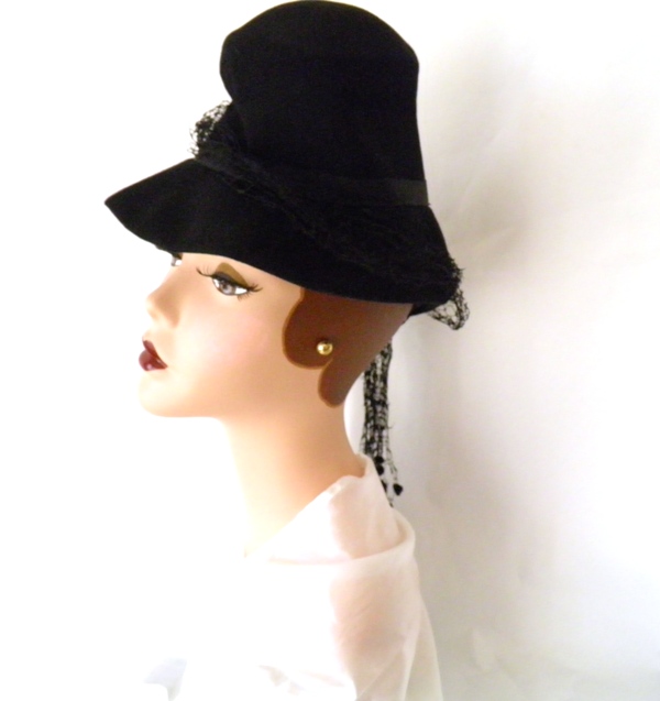 Black felt forward tilt stovepipe hat. Back flap keeps the hat on the head and tilted forward. Crown is encircled with black grosgrain ribbon and netting which ends in a 16 inch tail.